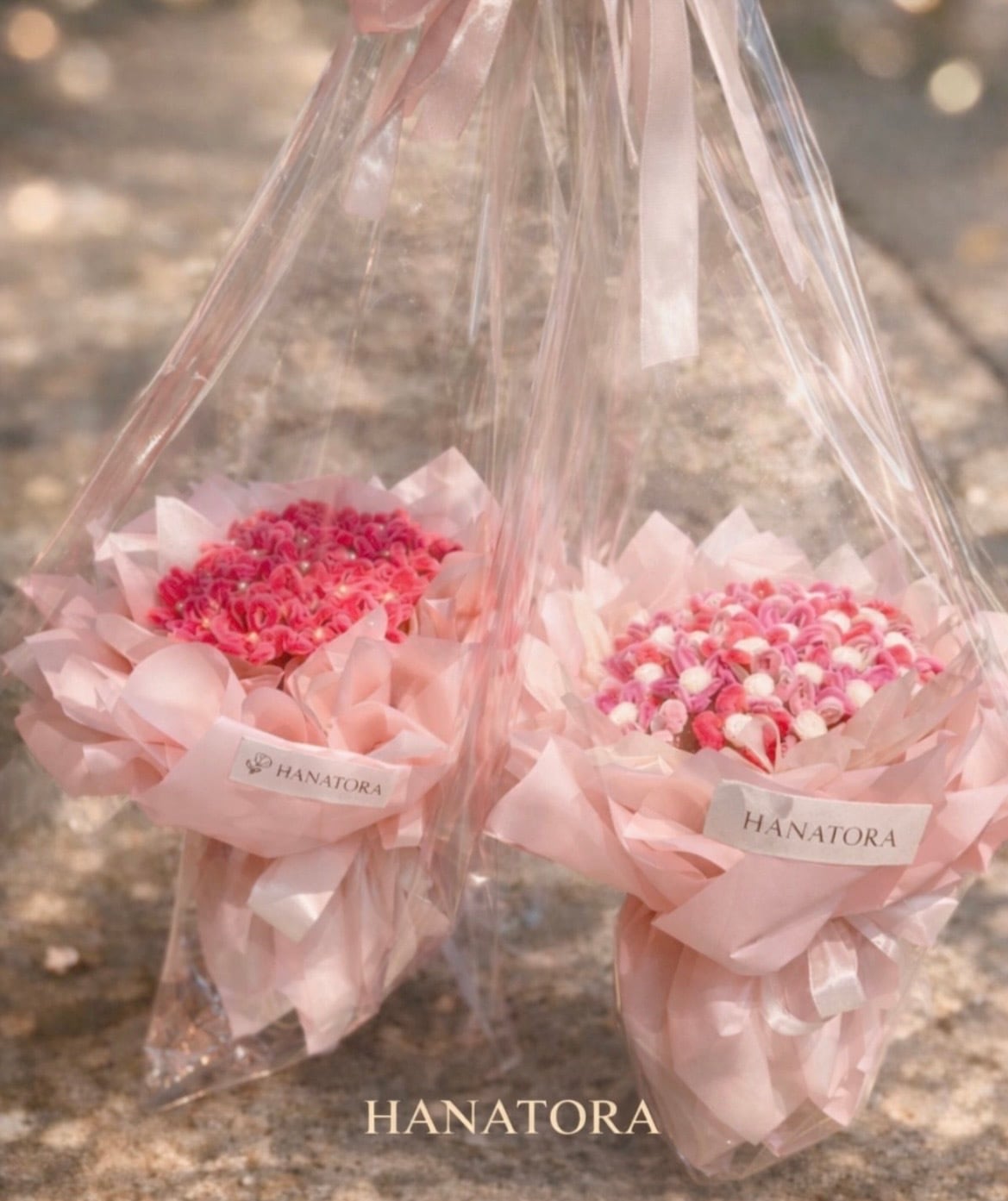 ふんわりとした桃色のお花を束ねた、 やさしく可愛らしいブーケです。 ・ラッピング仕様のため、そのままギフトとしてもご利用いただけます。 やわらかなモール素材で 一つひとつ丁寧にお作りしています。 パールをあしらったお花と ふんわりしたリボンで、 HANATORAらしい上品で可愛い雰囲気に仕上げました。 枯れないお花なので お部屋のインテリアとしても 長くお楽しみいただけます。 卒園・卒業のお祝い、 発表会や誕生日などの ちょっとしたギフトにもおすすめです。 ひとつひとつ心を込めて制作しております。 本商品の売上の一部は、 障害のある方々の未来を応援する **「未来基金」**として大切に積み立てております。 小さなお花の贈り物が、 誰かの未来の力につながりますように。 HANATORAでは、 やさしさや温かいご縁を大切に 活動してまいります。